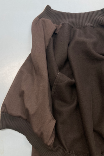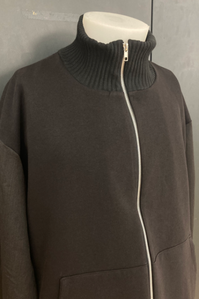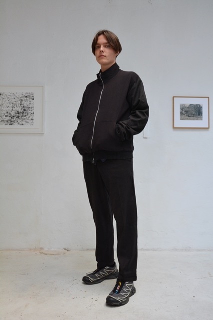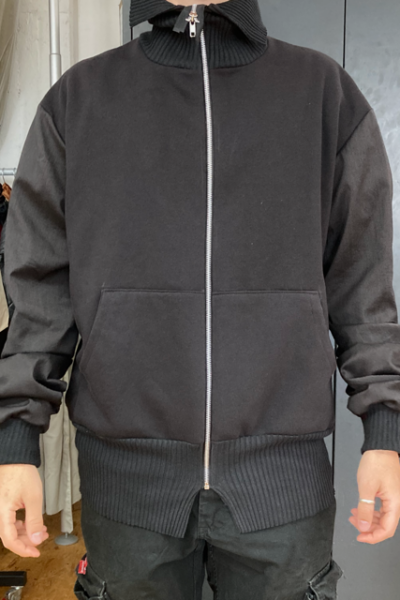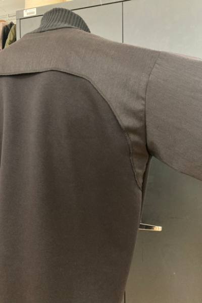 Die Verwendung gleicher Nuancen in Farbgebung und Stoffen verstärkt diese Verbindung zusätzlich. Im Oberteil bestehen die Ärmel und der Kragen aus klassischem Anzugshosenstoff aus Schurwolle und Seide, während die Ärmel zusätzlich mit einem weichen Futterstoff versehen sind. Die Innenseite des Reißverschlusses und die Taschen sind ebenfalls mit diesem Stoff genäht. Breite, weiche Strickbündchen schmücken die Ärmel, den Kragen und den Hüftbund. Der Hauptteil der Jacke besteht jedoch aus klassischem schwarzen Sweatstoff und wird durch diese Details komplementiert.