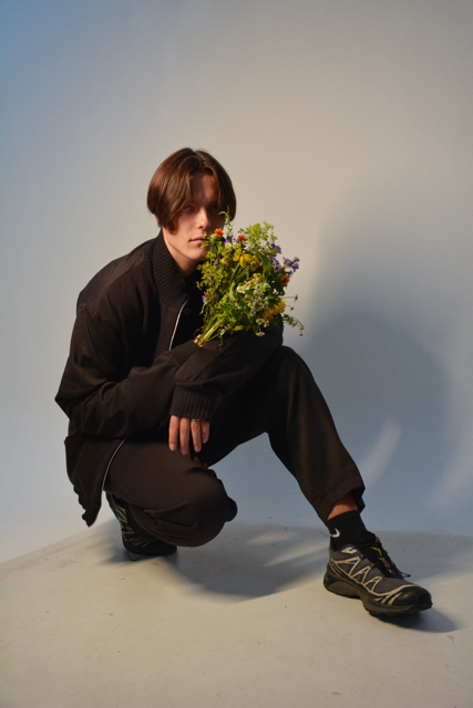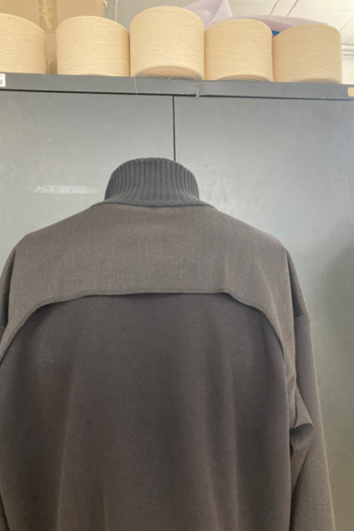 Auch mein Kleiderschrank war eine Inspirationsquelle für den Schnitt und das Design. Insbesondere eine alte Sweatshirtjacke meines Vaters, die er mir übergeben hat, beeinflusste die Passform des Oberkörperbereichs des Tracksuits. Auch die Kängurutasche der Jacke floss in das Design ein. Durch die Verlängerung des Schnitts mit Strickbündchen und die Vergrößerung der Armlänge entstand der Effekt von weiten, ballonartigen Ärmeln. Die Rückseite des Oberteils und der Hose zeigt Andeutungen einer Rückenpasse, ähnlich wie bei einem Trenchcoat, was die beiden Teile durch Form und Symbolik verbindet.