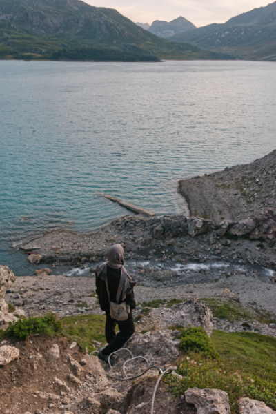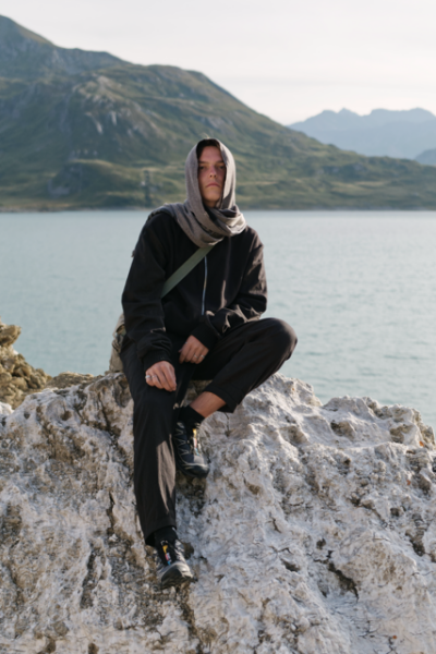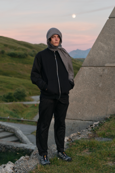 Das zweite Shooting ging eher in die Richtung eines kleinen Editorials. Dafür arbeitete Ich zusammen mit Jan Malte Röhm einem langjährigen Freund und Kollaborationspartner in unterschiedlichsten Fotoprojekten. Dieses Shooting war freier und präsentierte den Tracksuit in Bewegung, betonte eine sportlichere Tragweise und zeigte verschiedene Styling-Optionen mit Schal und Tasche. Die Fotos spielen sich in den Bergen Frankreichs und Italiens ab und kombinieren die Eleganz der Anzugelemenete mit dem Motiv des Outdoorsports das sich durch die Tracksuitelemente wiederspiegelt.