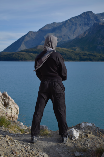 Die Hose verwendet die gleichen Stoffe, jedoch in anderer Anordnung. Die Hosenbeine bestehen aus Schurwolle, und auf extra Bündchen wurde verzichtet. Stattdessen wurde mit einem eingeschlagenen Hosensaum gearbeitet, der die Verbindung zu einer Anzugshose zeigt. Auch hier finden sich Elemente wie die Fütterung der Taschen im Sweatstoff. Schnallen mit Knöpfen machen den elastischen Hosenbund zusätzlich größenverstellbar, um eine optimale Anpassung an den Körper zu ermöglichen. Während des Nähprozesses wurden außerdem zwei Paspeltaschen als Gesäßtaschen in die Hose integriert.
